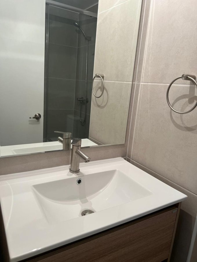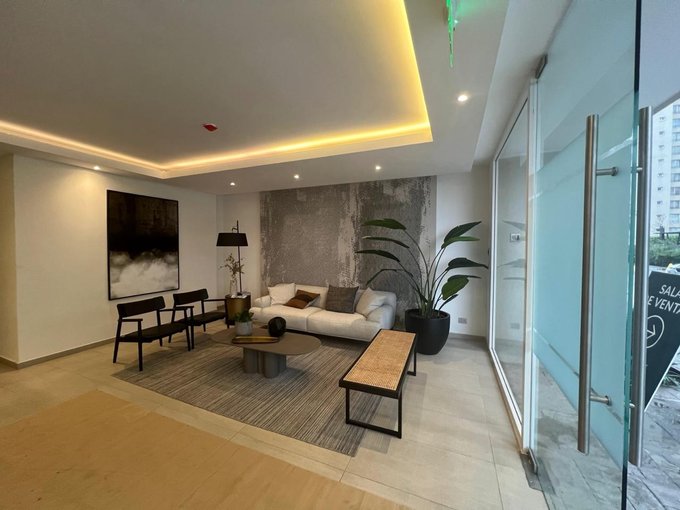 Las áreas comunes del edificio incluyen un hall de acceso con mobiliario contemporáneo y una piscina exterior rodeada de jardines, ideales para el esparcimiento. El balcón privado ofrece vistas despejadas a la ciudad y acceso directo desde el living, proporcionando un espacio adicional para disfrutar al aire libre. Los baños están equipados con lavamanos dobles y duchas con mampara de vidrio, mientras que los dormitorios cuentan con amplios closets y acceso a luz natural. Este departamento representa una opción práctica y cómoda en un entorno urbano consolidado.