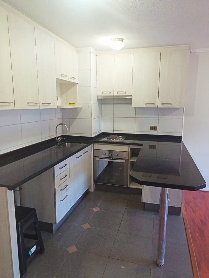 Sala con cocina full integrada de buen tamaño, conexión a lavadora