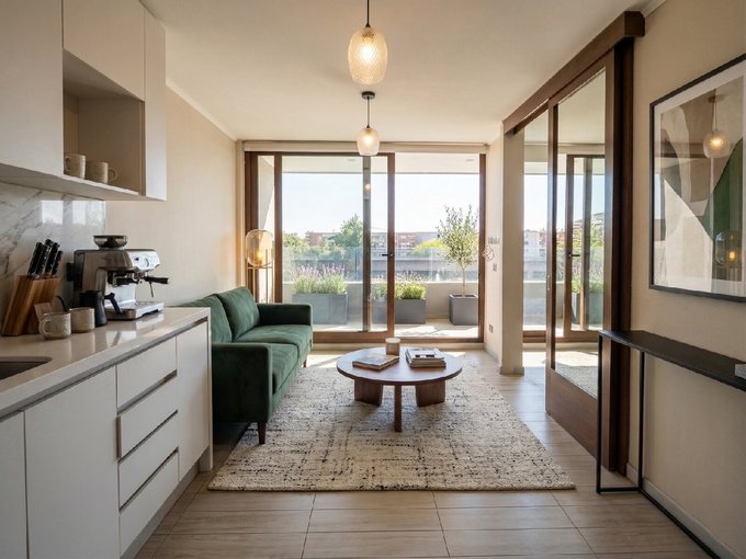 Se distribuye en living comedor con cocina americana, 1 dormitorios más un baño y balcón amplio.Piso 4.Orientación poniente,cuenta con conexión a lavadora.