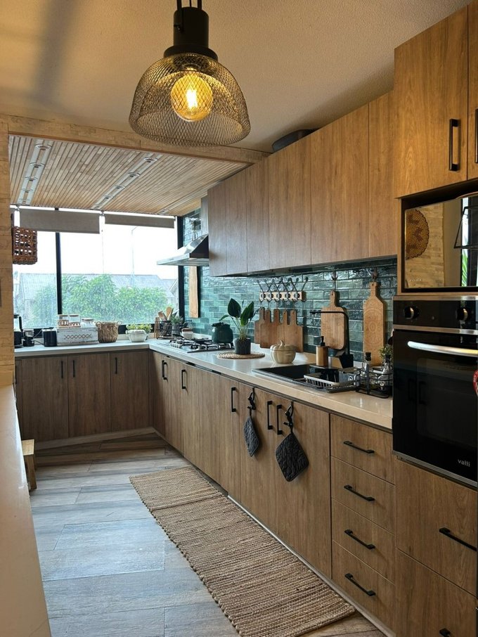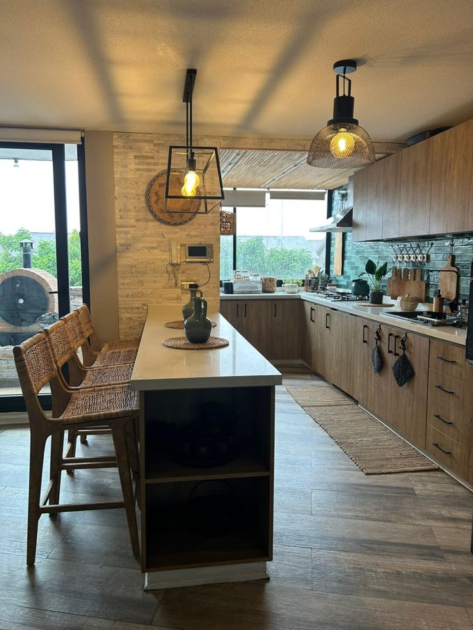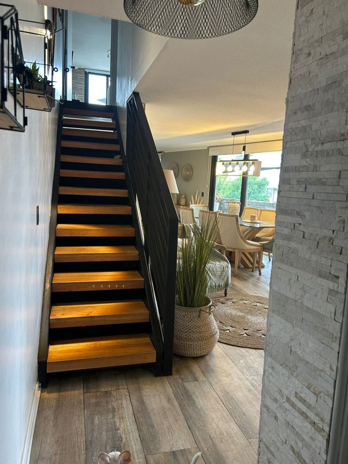 Detalles adicionales: Escaleras abiertas en madera robusta Muros de cuarzo en el living Piso porcelanato tipo madera Iluminación completa con lámparas Eglo Ventanales de termo panel que aprovechan la luz natural.