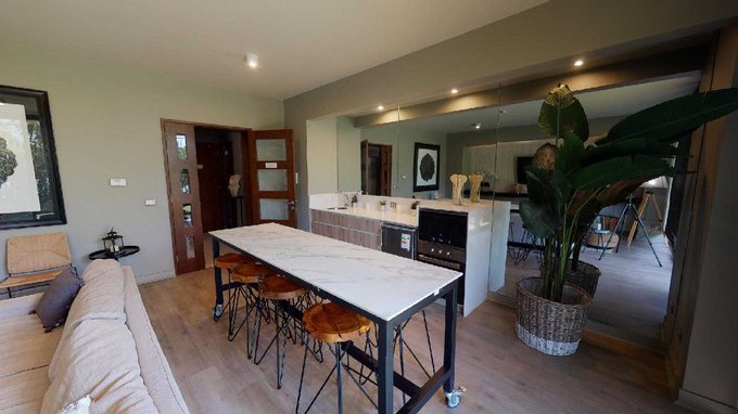 Dormitorio con closet y baño con Shower door y conexión a lavadora. Cocina americana equipada con encimera vitrocerámica, horno, campana y micoondas.