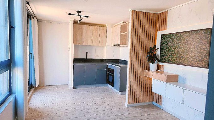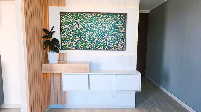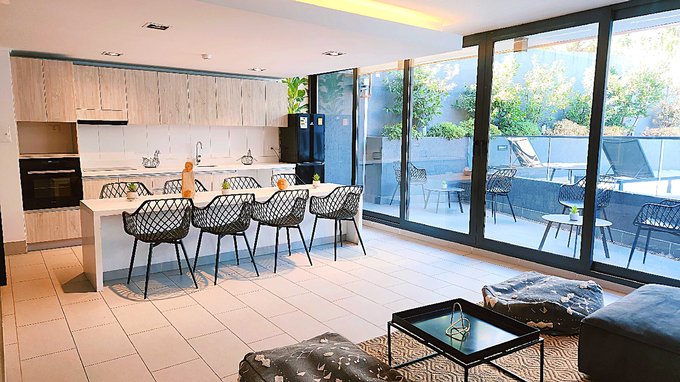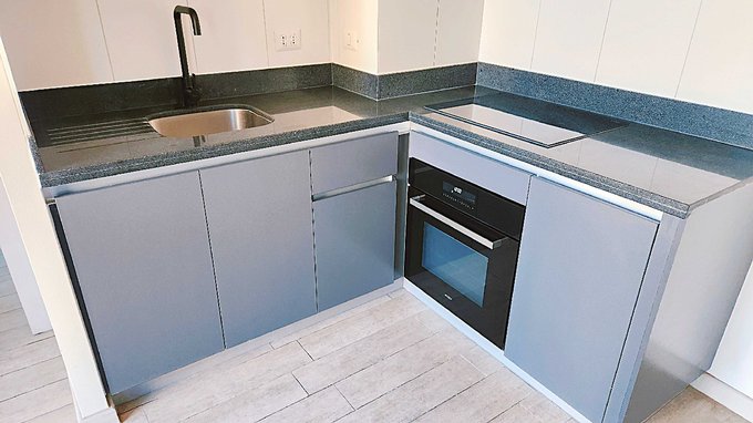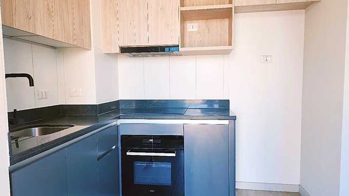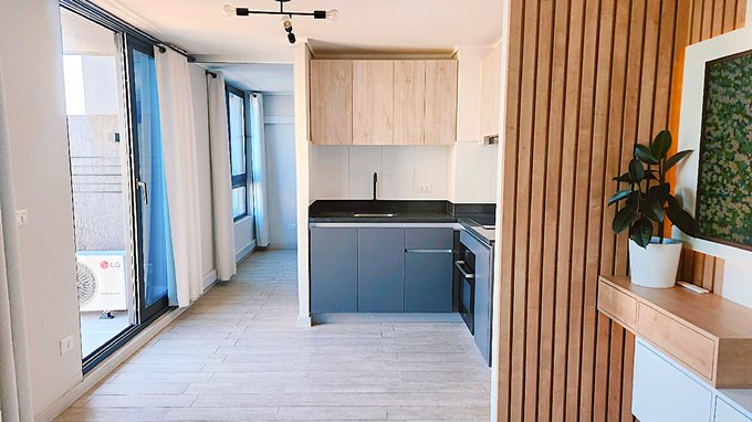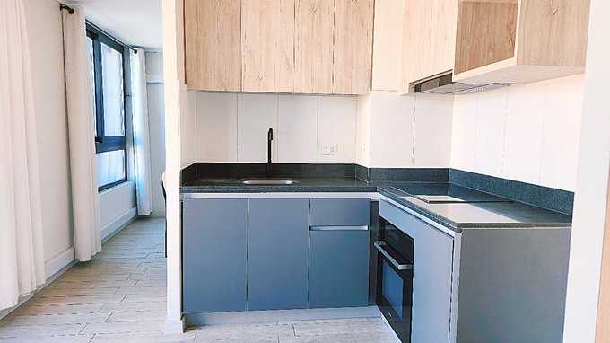 Linda cocina, equipada con muebles de excelente calidad, cubierta de cuarzo. Cocina vitrocerámica de 2 platos, horno y campana con ducto de salida para olores.