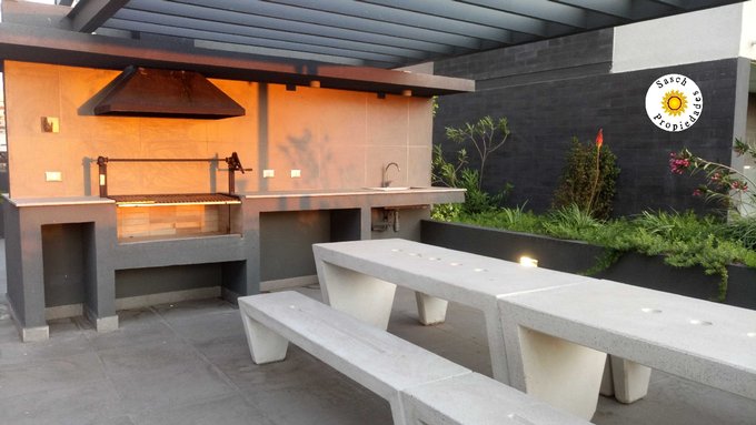 Hall de distribución, Living comedor, 1 Dormitorio en suite, closet, Baño shower door, Vanitorio con cubierta de granito, Cocina Americana amoblada y equipada, horno eléctrico, campana, encimera vitrocerámica, con CONEXION PARA LAVADORA, departamento con sistema de alarma, ventanas termopanel, persianas Roller, Lámparas, TV led, piso porcelanato imitacion madera, en dormitorios piso fotolaminado, con sistema loopwal giratorio, Calefacción central, Terraza y ESTACIONAMIENTO.