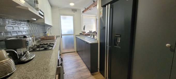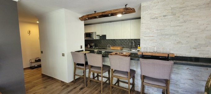 - Hall de entrada, barra comedor de 2 niveles, 2 balcones con vista al interior, cocina full equipada y amoblada (incluye refrigerador de 2 puertas, menaje y electrodomésticos varios), living con orientación norte y oriente,