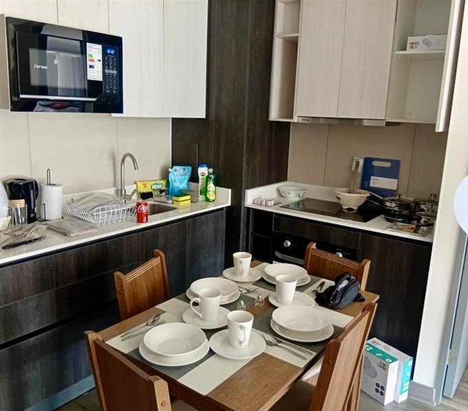 Cocina integrada full equipada con encimera , horno, campana, refrigerador, microondas.
