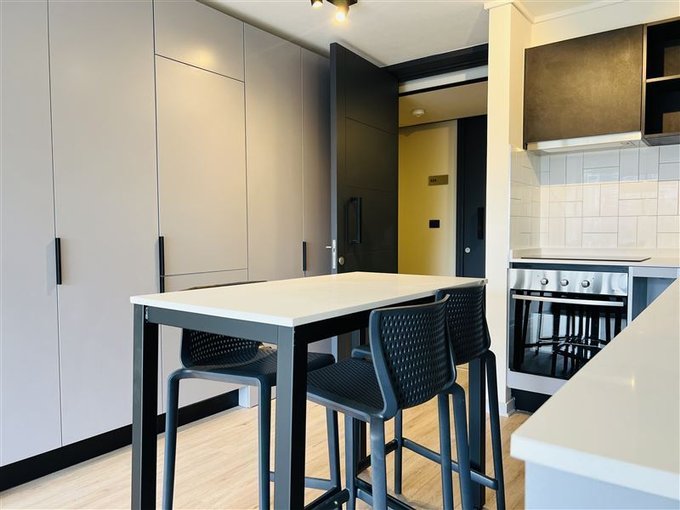 Living-comedor, Mesa con taburetes, futón.