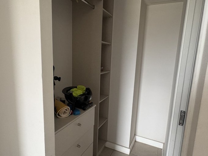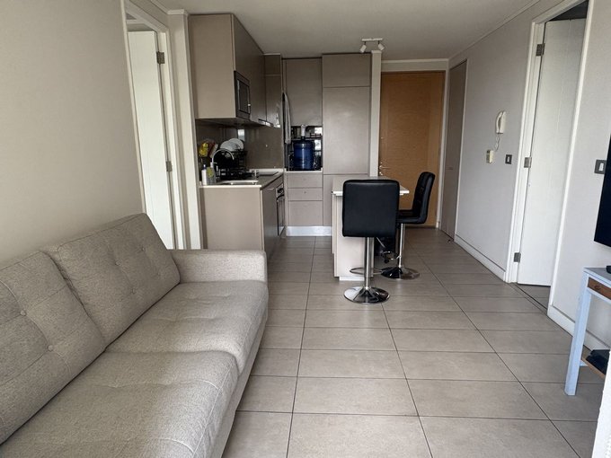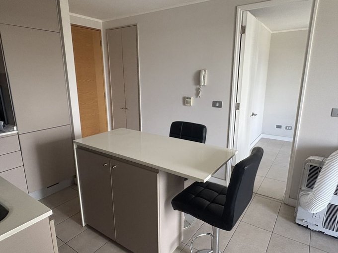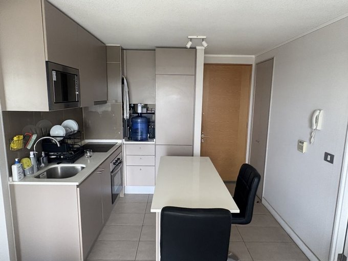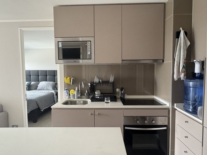 Puerta de acceso enchapada, piso gres porcelánico en todo el departamento cocina completamente equipada : Encimera vitrocerámica, Microondas, Horno empotrado, campana y Refrigerador. Muebles de cocina con cubiertas de cuarzo blanco.