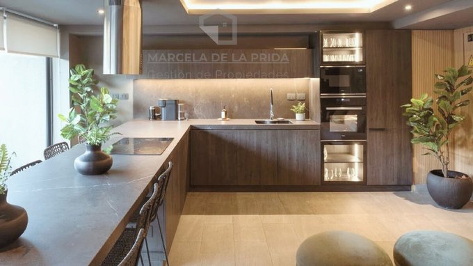 Cocina equipada con cubierta de cuarzo, encimera vitrocerámica, horno eléctrico y campana retráctil.