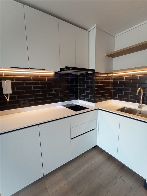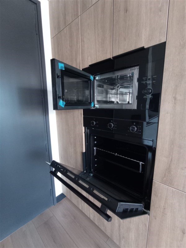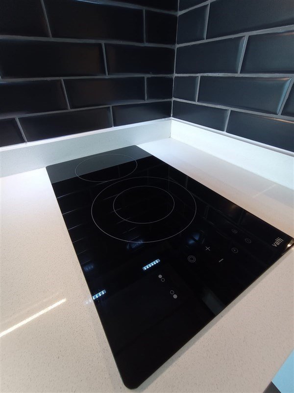 Cocina Americana con encimera eléctrica vitrocerámica, muebles con diseño empotrado para refrigerador, horno eléctrico y microondas, campana de extracción.