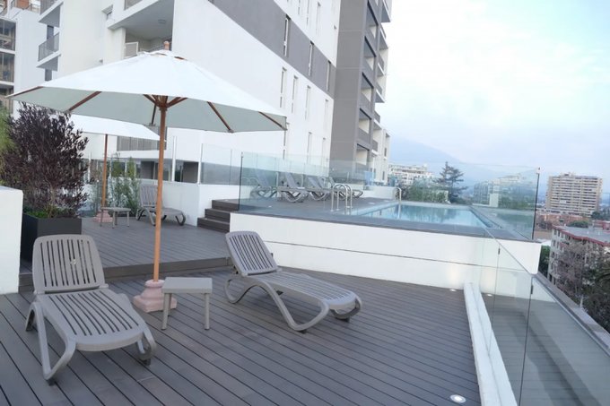 Bicicletero en estacionamiento. Espacios y servicios comunes: Conserje 24 horas. Personal de aseo. Piscina. Gimnasio. Amplia Sala de Eventos. Amplias Terrazas de uso común. Estacionamiento de visitas. Bicicletas de préstamo y uso común. Accesos controlados. Áreas verdes. Circuito cerrado de tv. Citófono. Portón eléctrico. Dos ascensores de última tecnología. Dos quinchos en terrazas independientes con vista panorámica. *Las fotos publicadas son referenciales, el departamento no está amoblado.