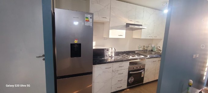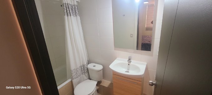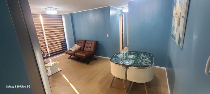 Departamento amoblado con camas una King y otra de 1 1/2, refrigerador, lavadora, comedor, cocina completamente equipada, dos televisores, estacionamiento, piscina, quincho con sala de eventos, guardia las 24 horas, cámaras y serco eléctrico, cercano a jardin, escuela, supermercado y a 20 minutos del centro a pie.