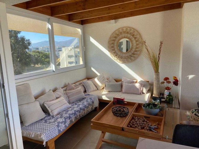 Consta de: 2 dormitorios, (1 principal en Suite, 2do dormitorio con cama , estantería y escritorio para trabajar), 2 baños completos , Cocina abierta equipada con refrigerador , horno, microondas ,encimera eléctrica , lavadora , living comedor , terraza con vistas a los jardines y piscina