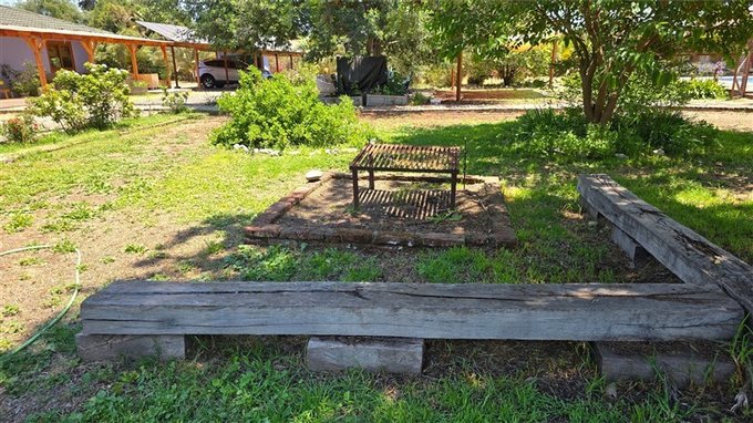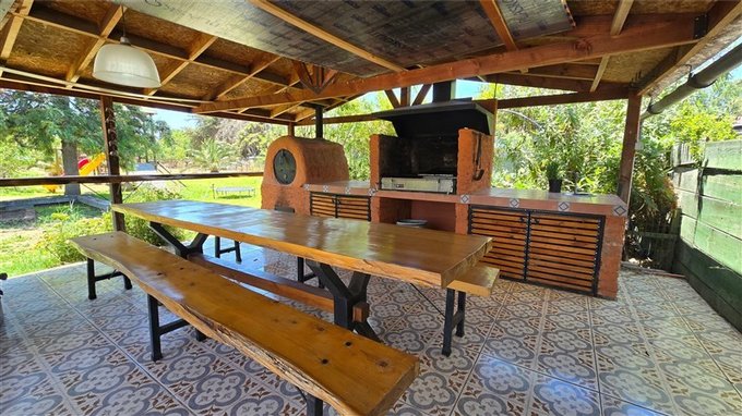 Quincho cubierto con parrilla, lava manos, horno de barro y mesa de madera larga con bancos