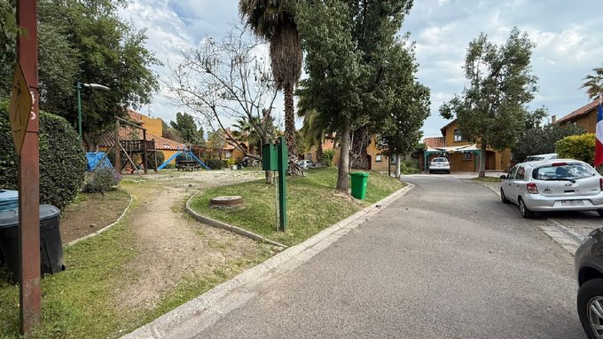 Condominio con espacios comunes áreas verdes y plaza para niños.
