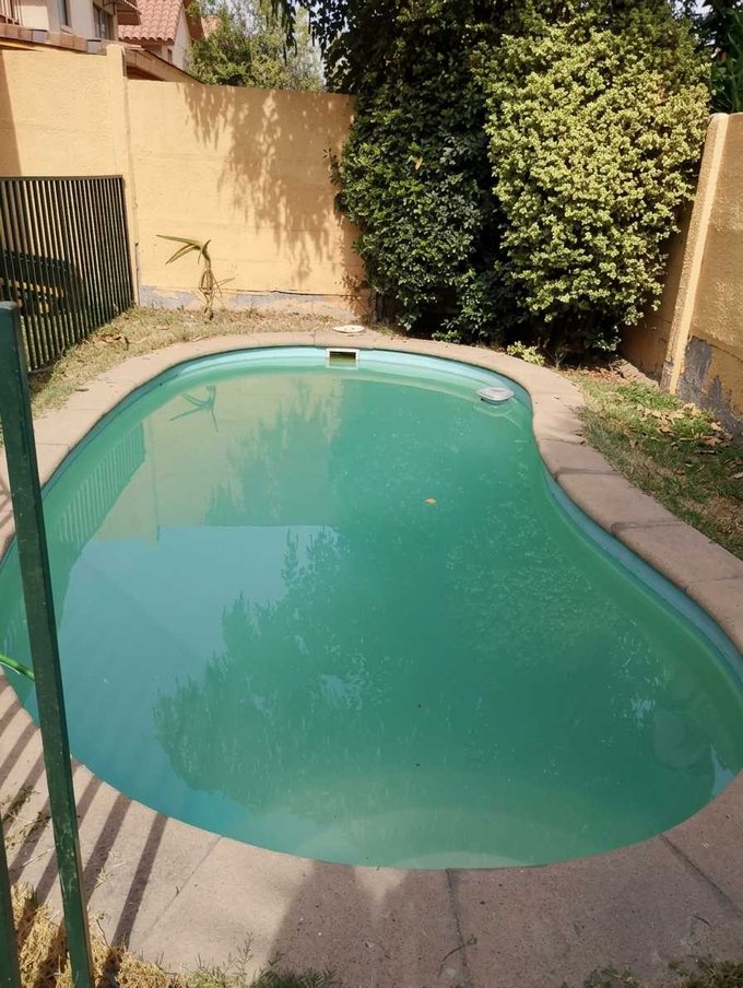 Terraza techada, piscina y estacionamiento.