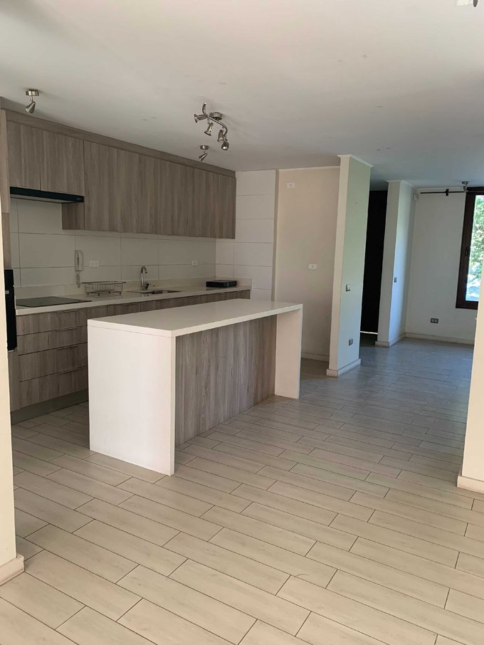 Amplia y cómoda cocina integrada con mesón isla y cubierta de silestone, amoblada y equipada con horno, encimera y campana eléctricos