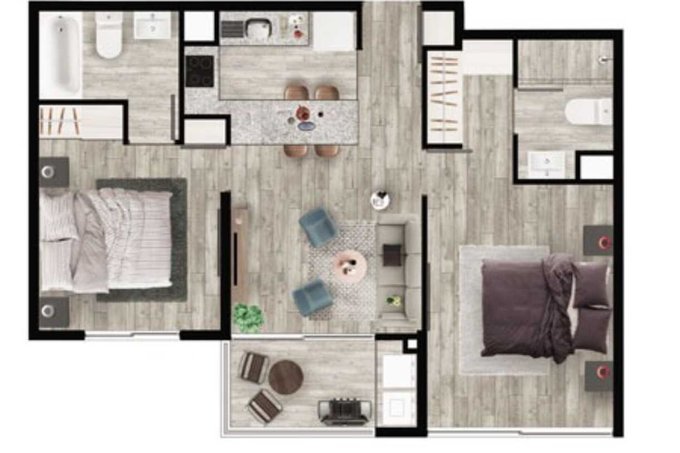 Este luminoso y moderno departamento mariposa cuenta cocina americana equipada, logia, living comedor juntos, con salida a acogedora terraza, 2 dormitorios y 2 baños, diseño funcional y contemporáneo.