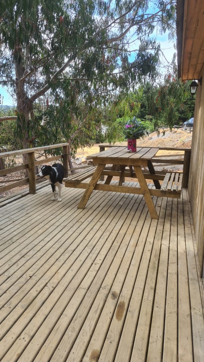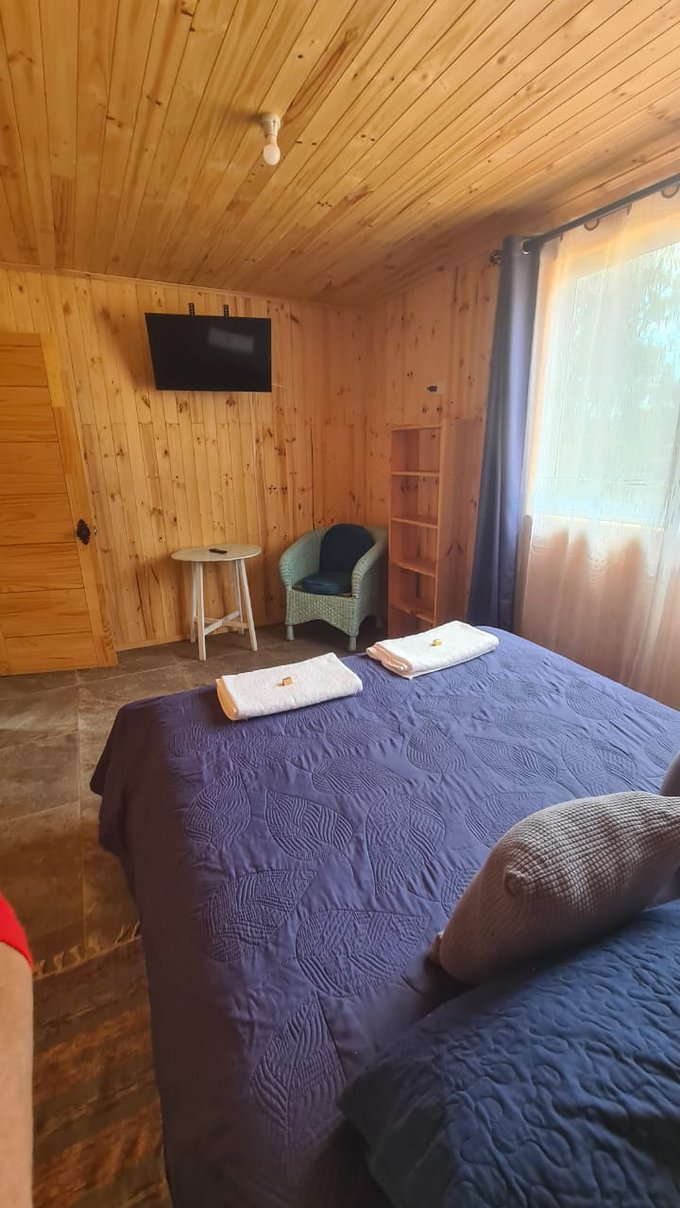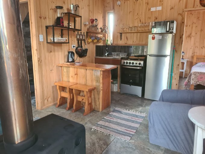 La casa cuenta con 2 dormitorios, comedor y cocina full equipados con loza, cocina con horno, refrigerador, microondas, licuadora y hervidor electrico, ademas, en el living cuenta con una Bosca a leña y un Tv, al igual que en el dormitorio principal, el baño con agua caliente las 24 Hrs. del día. Afuera tiene un amplio estacionamiento con capacidad para al menos 4 autos, tiene parrillero, comedor exterior con juego de sillones exteriores para disfrutar de la calma y naturaleza que rodea la casa, y tambien cuenta con una amplia bodega que tiene instalacion para lavadora, y espacio para bicicletas, tablas de surf y leña.