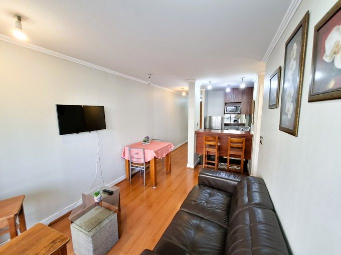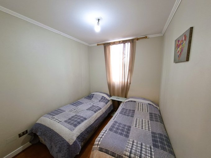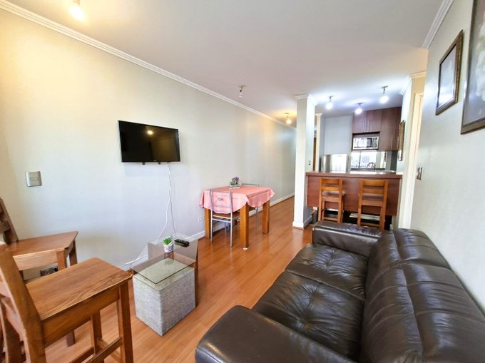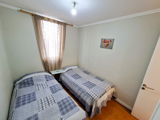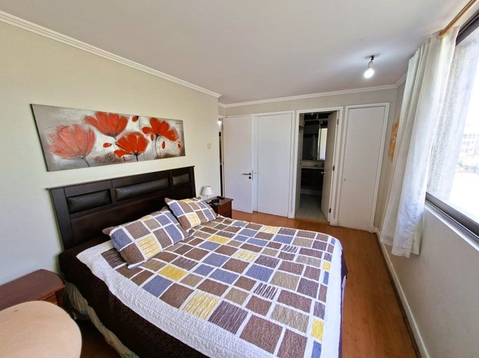El departamento esta en un piso 3 con orientación sur-poniente, este consta de 1 dormitorio matrimonial en suite con cama de 2 plazas y un segundo dormitorio con 2 camas, baño equipado, living con sillón y mesa de centro, Cocina con mesón, sillas y equipado con refrigerador, horno microondas, hervidor eléctrico, encimera y horno eléctrico.