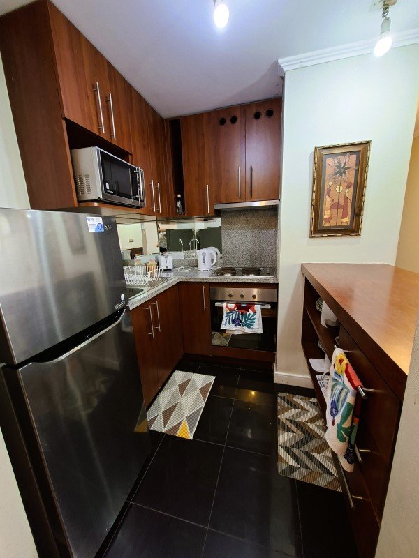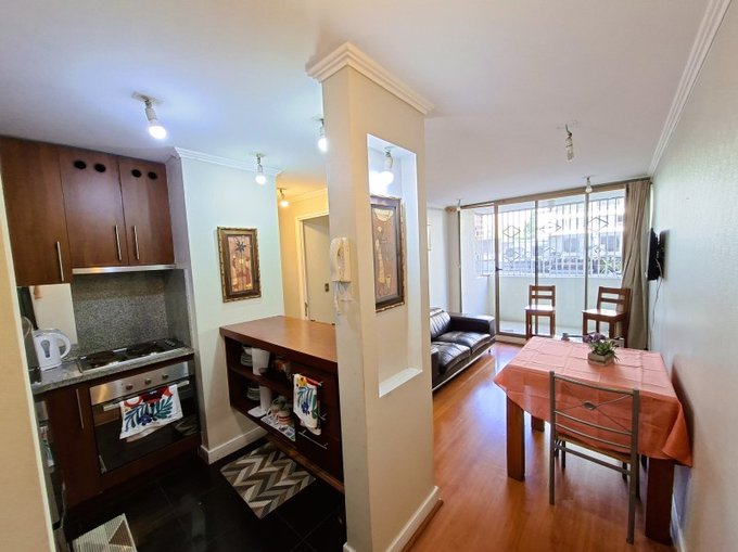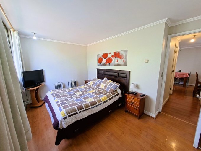 El departamento esta en un piso 3 con orientación sur-poniente, este consta de 1 dormitorio matrimonial en suite con cama de 2 plazas y un segundo dormitorio con 2 camas, baño equipado, living con sillón y mesa de centro, Cocina con mesón, sillas y equipado con refrigerador, horno microondas, hervidor eléctrico, encimera y horno eléctrico.