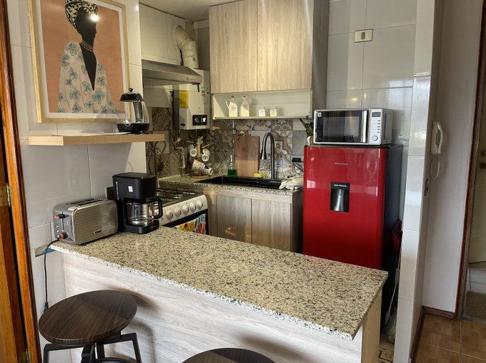 Cuenta con un ventilador y un calefactor, no tiene conexión a lavadora pero en el edificio hay lavandería y el lavado y secado vale $ 1.500