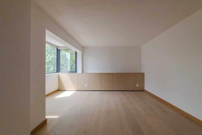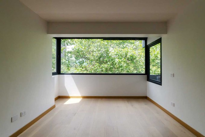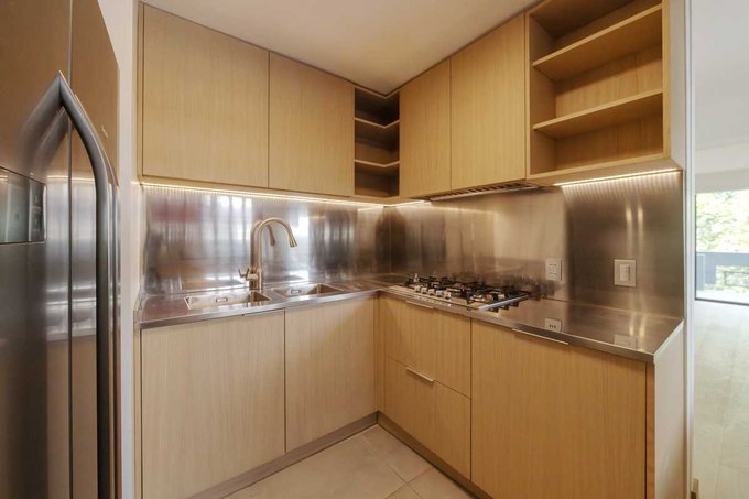 El espacioso living y comedor se encuentran parcialmente integrados con la cocina, la cual se abre a una agradable terraza con vista al oriente. En el living, destaca un enorme librero, ideal para decorar el espacio. La cocina está equipada con modernos muebles y cubiertas de acero inoxidable, amplio espacio de almacenamiento y sofisticados artefactos de cocina. El piso de madera, ventanas de termopanel PVC y la calefacción suministrada por el edificio complementan este exclusivo espacio.