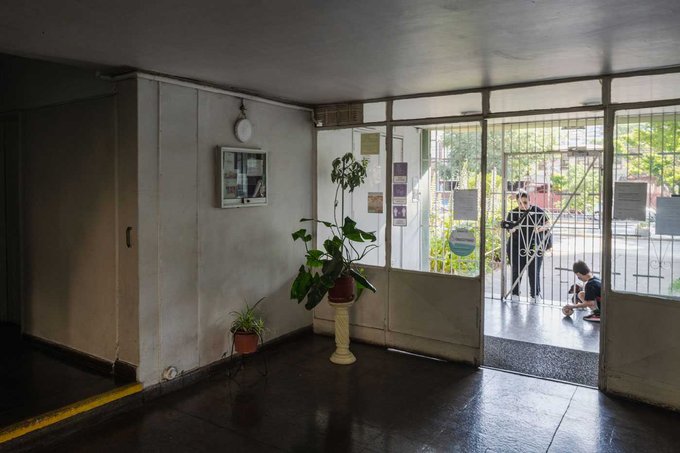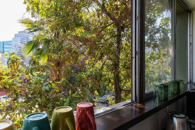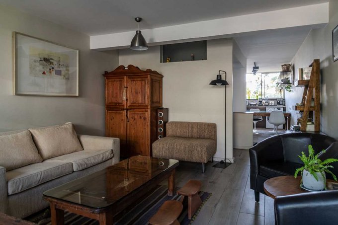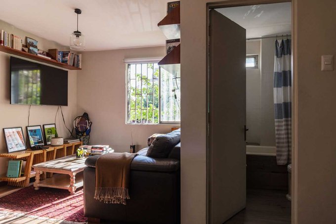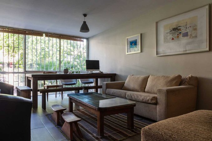 El gran living con orientación oriente mira al parque central de la Unidad Vecinal y sus añosos árboles. Además, en este piso se mantuvo un baño de visita.