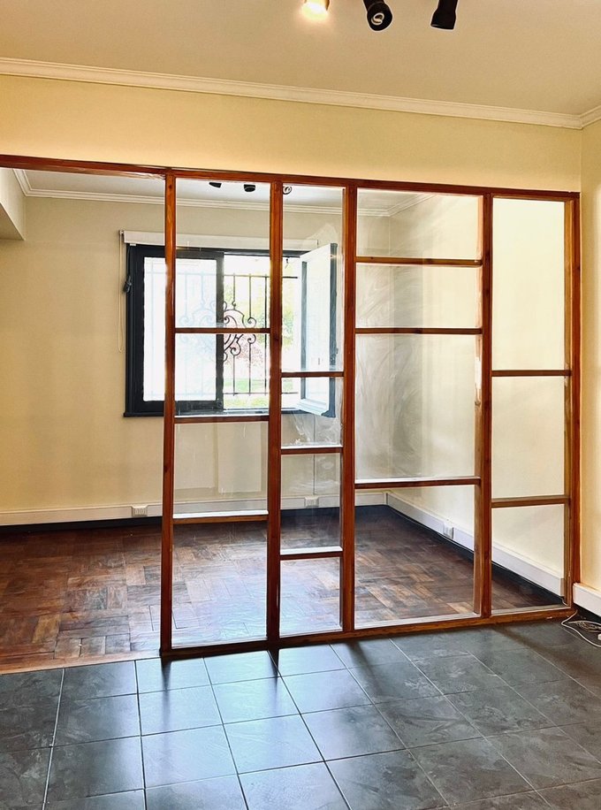 -Sala de reunión con piso de parquet y tabiquería vidriada que puede ser utilizada como tercer privado;