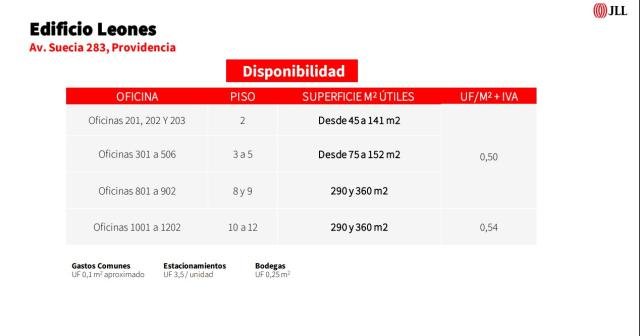 ProCasa La Dehesa (Oficina Carloshurtado Propiedades) ARRIENDA Magníficas OFICINAS Nuevas (sin uso previo) en el corazón de la Comuna de providencia. Ubicada en la prestigiosa calle Suecia, muy cerca de la Avenida Nueva Providencia (a pasos de la Estación de METRO Los Leones); Muy cerca de Hoteles, Restoranes, Bares, Tiendas, Centros Comerciales, Bancos, Farmacias y toda suerte de comercio minorista establecido en la comuna de Providencia. OFICINA: 202 y 203 * Ubicación: Segundo piso * Superficie: 90 m2 * Valor del arriendo: UF 0,50 + IVA por m2 * Valor mensual del arriendo: UF 45.00 + IVA * Valor del arriendo en pesos (estimado): $ 1.600.000 * Valor de Gastos Comunes: UF 0.10 por m2 * Valor de los Estacionamientos: UF 3,50 + IVA c/u * Bodegas: UF 0,25 + IVA por m2 * Condiciones de entrega: en bruto (por habilitar) * Oficinas disponen de un (1) baño * Disponibilidad: Inmediata * Se puede unir oficinas contiguas disponibles * Período de gracia para habilitación: 2 meses por contratos a partir de tres (3) años * Factibilidad de que el propietario financie la habilitación (valor se cobra según período de contrato) . Procasa: 62315