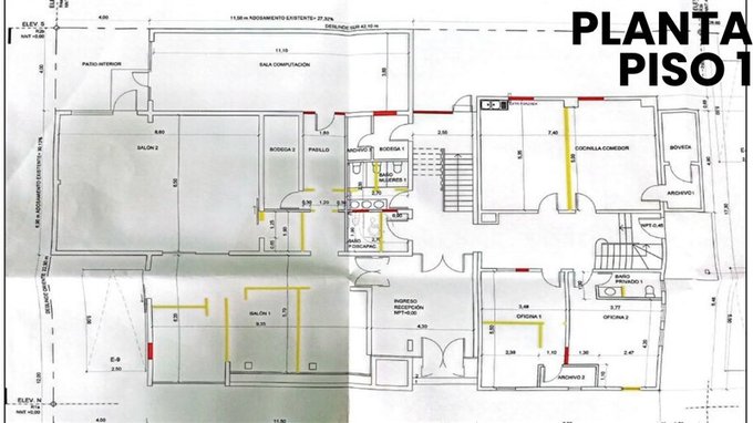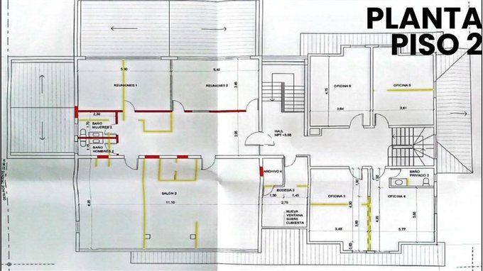 - Segundo piso: 3 oficinas, 2 salas de reuniones, 1 salón, 1 bodega y 3 baños.