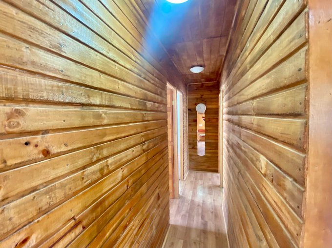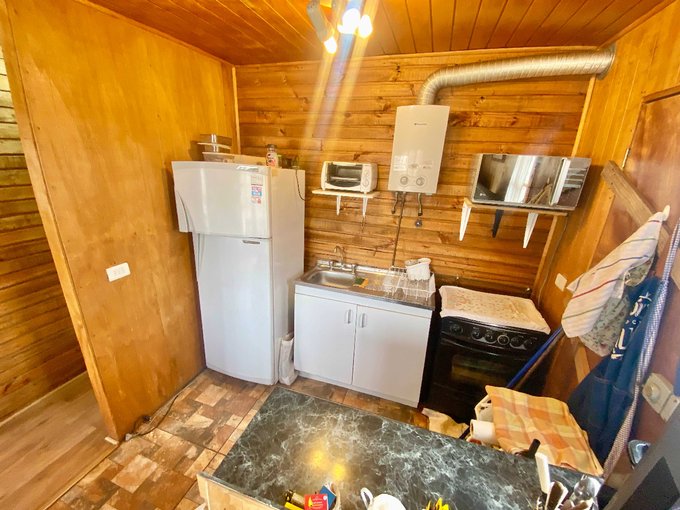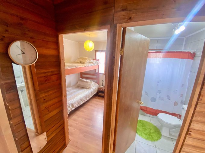 La cabaña de 54 metros cuadrados cuenta con agua potable y conección a la red de alcantarillado, medidor de luz, 3 habitaciones, un baño, living comedor conectado a la cocina del tipo abierta. Tiene espacio para estacionar 3 automóviles, ademas de una bodega.