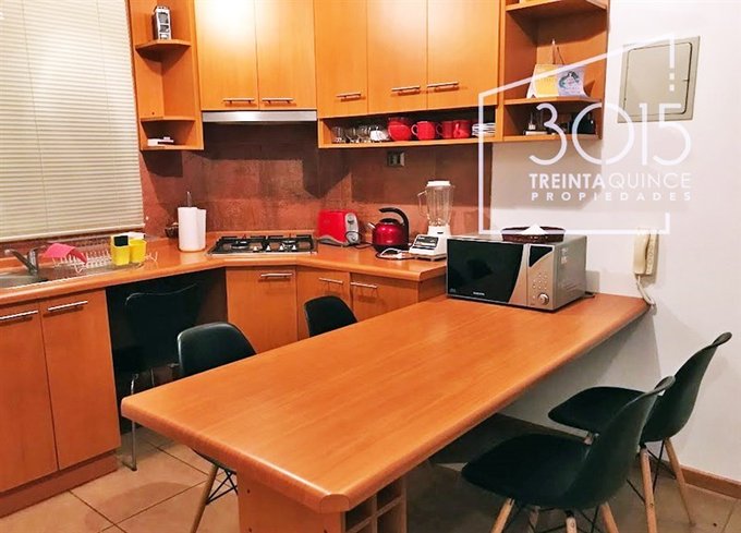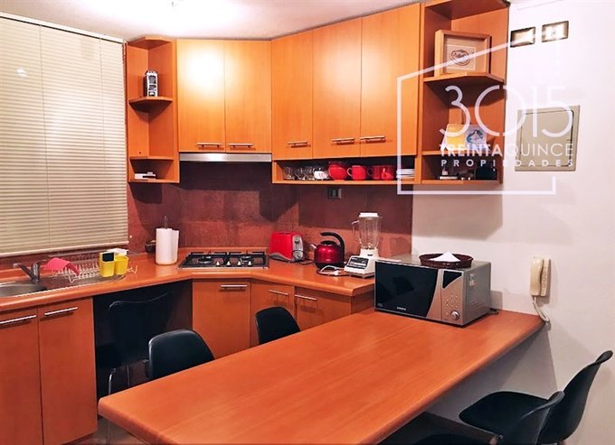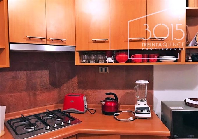 Cocina iluminada tipo Americana, cuenta con encimera de 4 Platos, Horno y Campana, Refrigerador, Microondas,