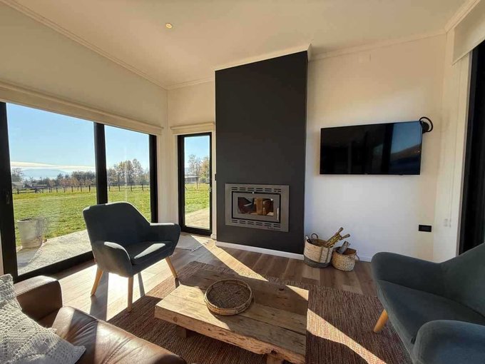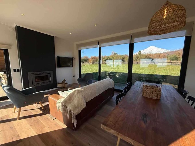 - Living comedor con ventanales por ambos lados, con vista al volcán y al jardín, además de una salida directa al quincho