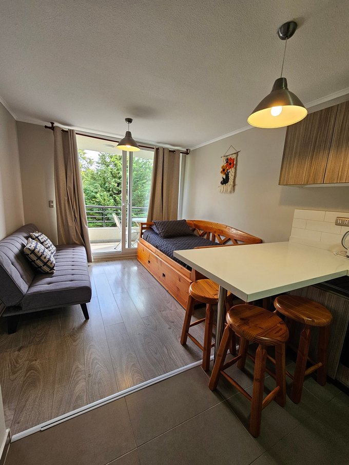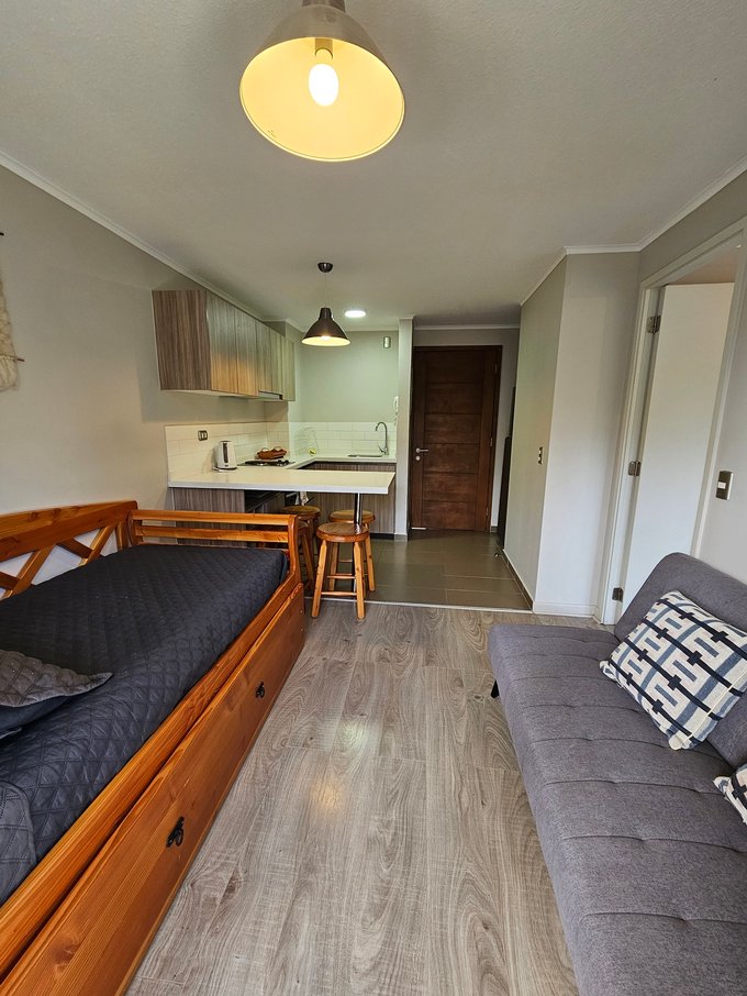 Valmanic Propiedades arrienda año corrido un acogedor y cómodo departamento de 1 dormitorio y 1 baño, completamente amoblado, emplazado en un cuarto piso con ascensor. Con orientación poniente y terminaciones de alto estándar, este espacio ofrece calidad, diseño y un entorno natural único, cercano al centro de esquí y a minutos de los principales atractivos de Pucón.