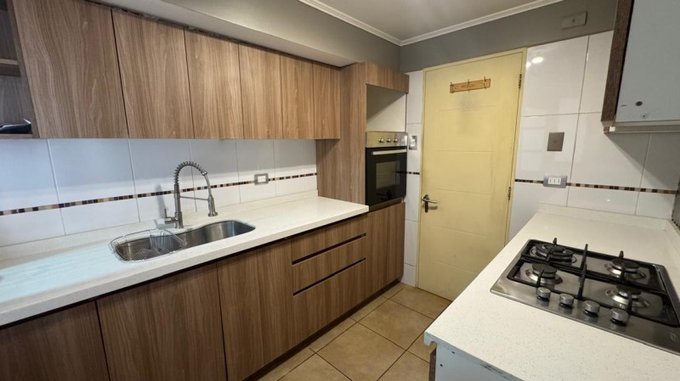 Cocina moderna con cubierta de cuarzo, horno empotrado, encimera marca FDK y campana retráctil.
