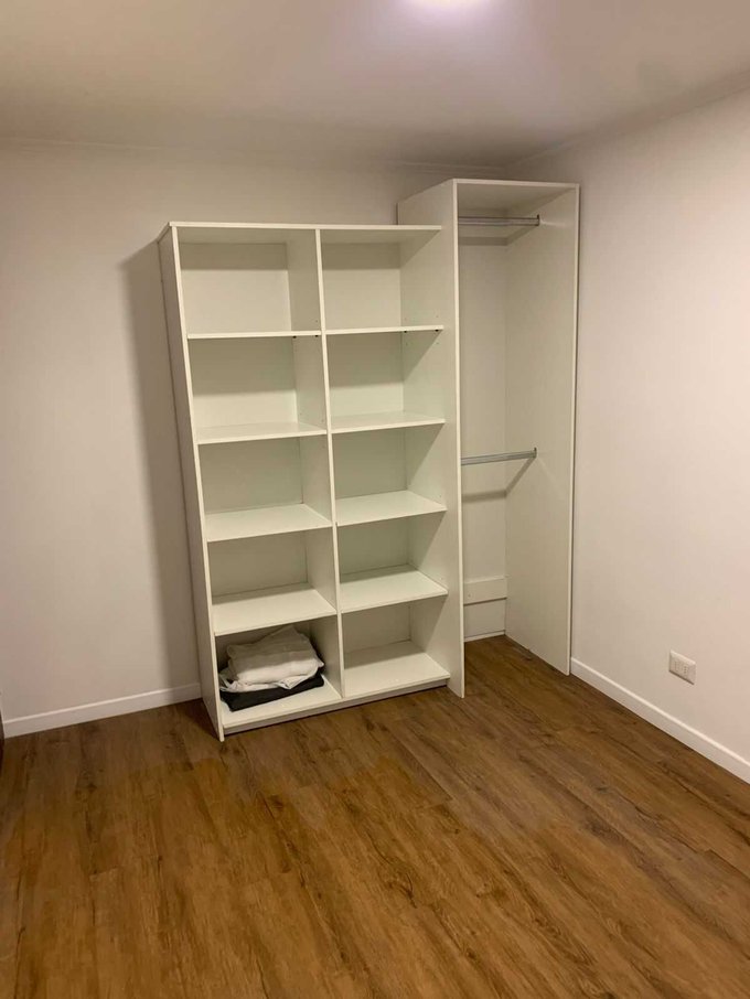 Casa de un piso, dos dormitorios, closets y un baño completo, living comedor, cocina amoblada, antejardín y amplio patio trasero, parrilla.