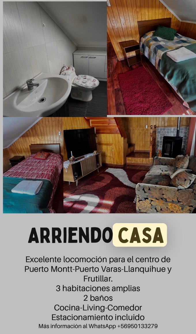 Se arrienda casa a matrimonio o pareja en Puerto Montt, cerca de Clínica Puerto Montt y del Hospital Regional. Excelente locomoción hacia el centro, Puerto Varas, Llanquihue, Frutillar, Chiloé Osorno, entre otros lugares. No se admiten mascotas ni tampoco niños pequeños.