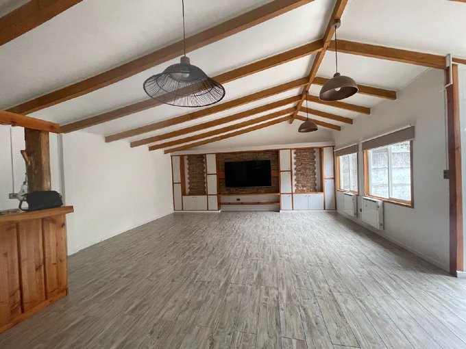 La propiedad cuenta con 3 dormitorios (1 en suite con walk-in closet), 2 dormitorios amplios con clóset empotrado, amplia sala de estar y living comedor espacioso con bar incorporado. Dispone de 4 baños: 2 completos y 2 de visita/servicio. Cocina amoblada y equipada, lavandería, patio con cerámica y leñera.