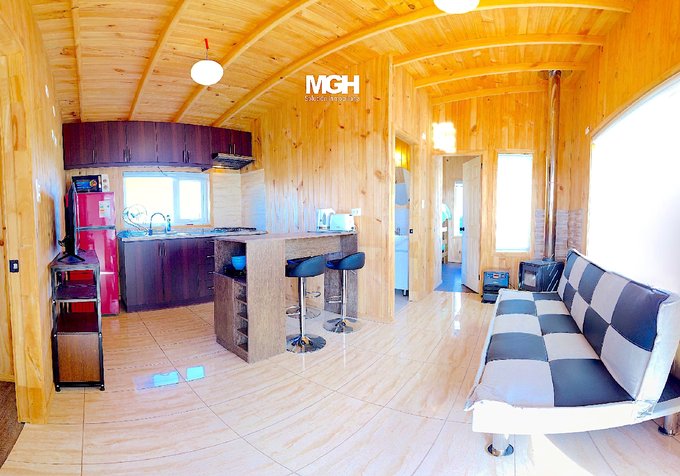 Incluye: refrigerador, microondas, lavadora, cama de 2 plazas para habitación principal y camarote para el segundo, estufa tipo Toyotomi para máximo confort, vajilla completa, 2 Smart TV de 32", futón y taburetes telescópicos.