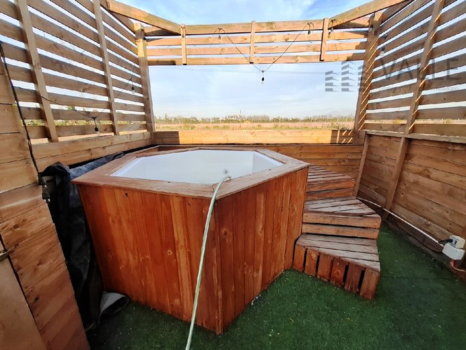 Tinaja de fibra de vidrio con calefón automático, de encendido con solo presionar un botón.