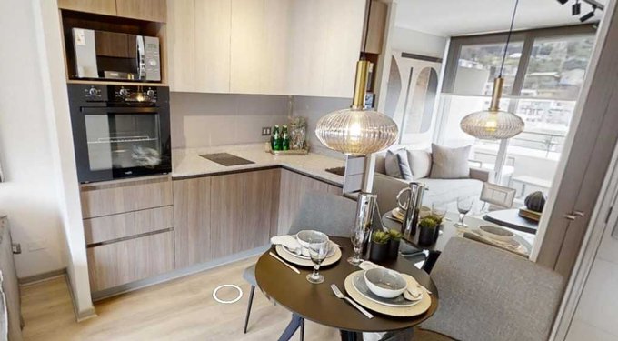 -Cocina abierta equipada con vitrocerámica y horno eléctrico.