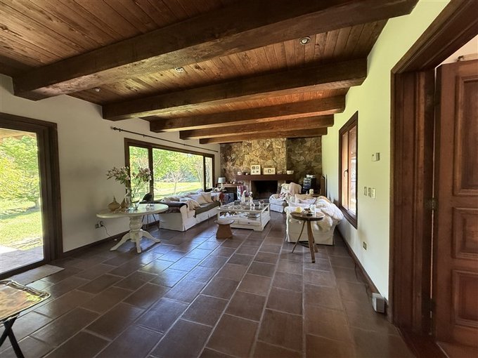 Al ingresar, un amplio hall da paso a un living y comedor independientes, con vigas a la vista y muros de piedra que otorgan carácter y calidez. La terraza conecta con un jardín consolidado, piscina y quincho techado que se convierten en el centro de la vida social. La casa dispone de 5 dormitorios y 4 baños, incluyendo una suite principal en el segundo piso con walking closet y balcón con vista al jardín.