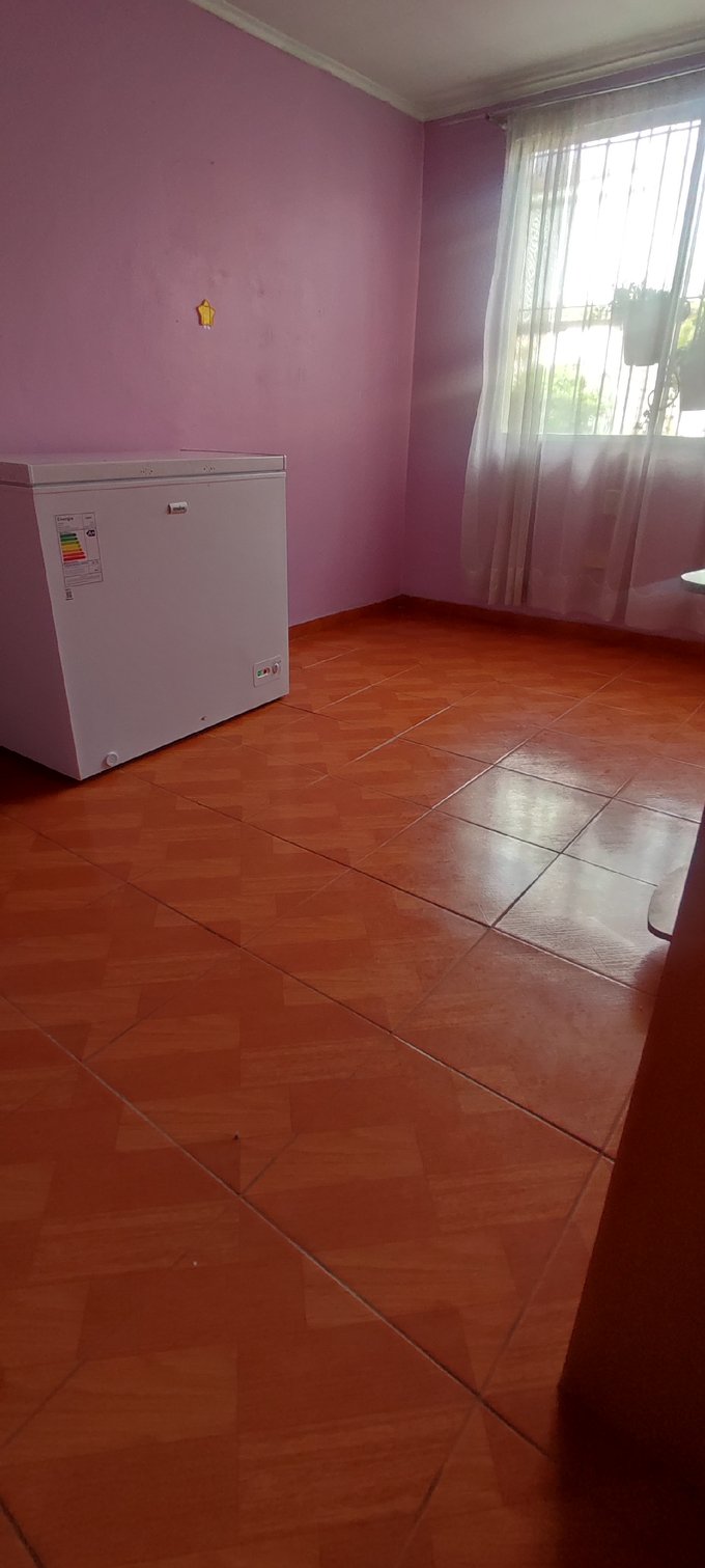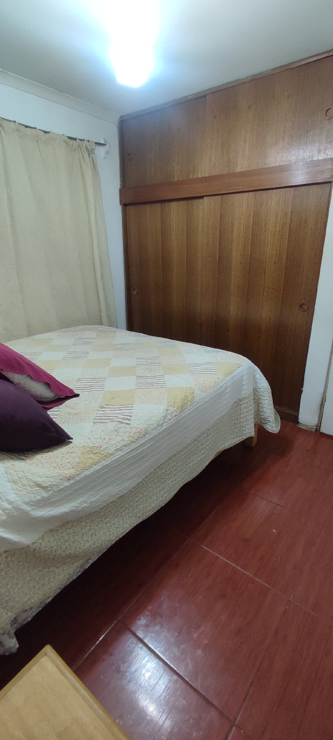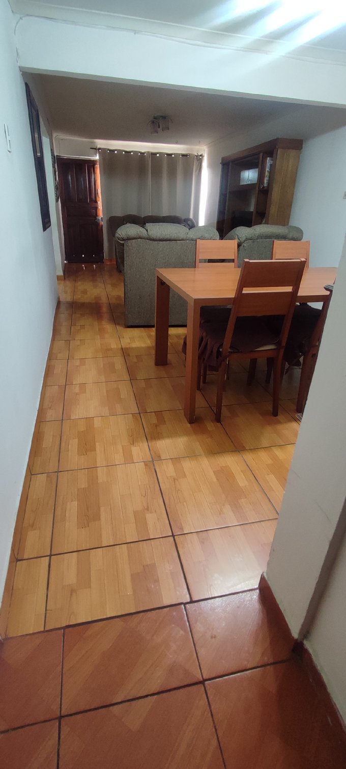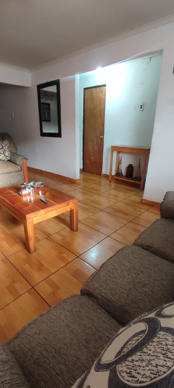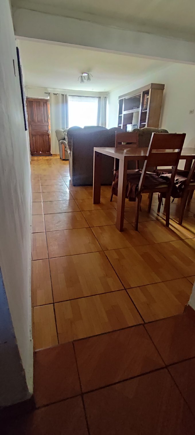 El interior cuenta con un living-comedor conectado, pisos cerámicos y ventanales al exterior que facilitan la iluminación natural del espacio principal. La casa cuenta con tres dormitorios, un baño completo y una cocina independiente equipada con muebles a medida y cubierta de fácil mantenimiento. Además, incluye una bodega que brinda espacio adicional para almacenamiento.