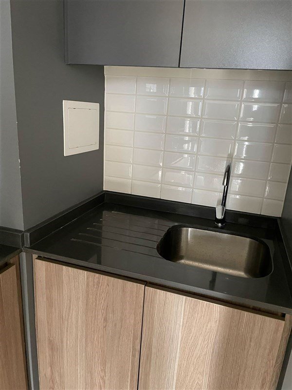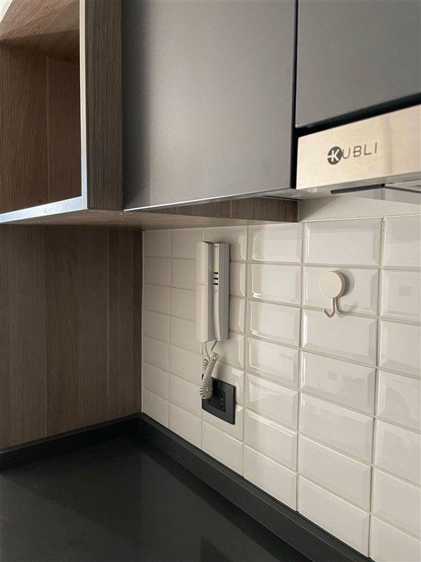 Cocina integrada, encimera eléctrica, horno empotrado, campana, muebles de almacenaje.