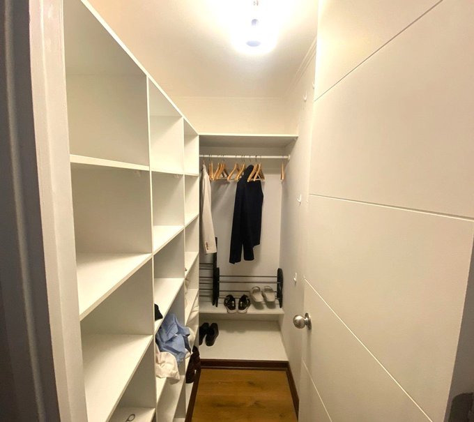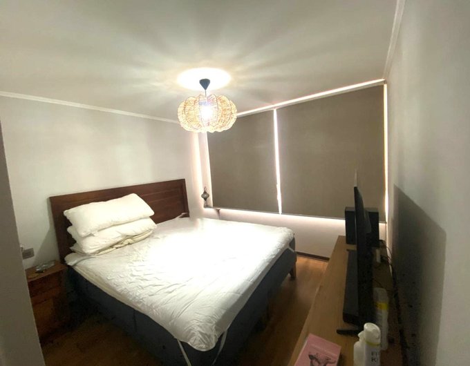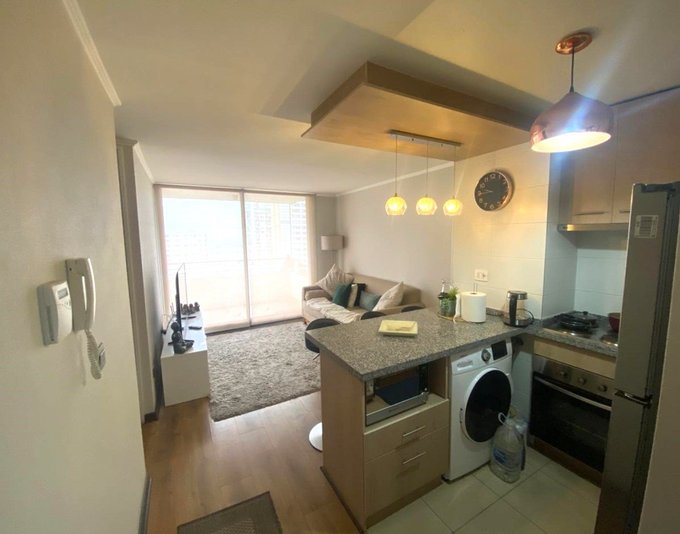 El departamento dispone de dos dormitorios. El principal es en suite, con walk-in closet y baño completo equipado. Incluye una cama de dos plazas, veladores, rack para televisor, cortinas roller y lámparas nuevas. El segundo dormitorio cuenta con cama nueva de una plaza, closet y cortina roller. La cocina es integrada y amoblada de estilo americano, equipada con lavadora, secadora, horno eléctrico empotrado, cocina de cuatro platos, refrigerador y microondas.