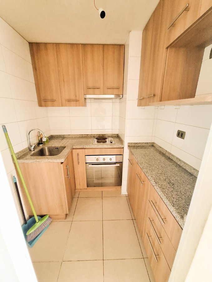 Cuenta con living comedor con cocina semi cerrada equipada con encimera, horno y campana. Balcón.