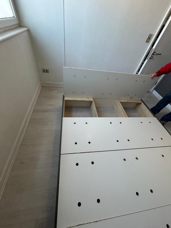 Dormitorio amplio, con respaldo y base de cama funcional (tiene secciones para almacenar como cajoneras).