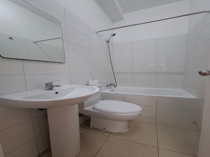 Cocina con Muebles Colgantes, Mesón de Cocina con encimera eléctrica de 2 platos, Horno Eléctrico y Campana, Lavaplatos, Espacio para instalar Lavadora y Refrigerador, cuenta con Termo Eléctrico 80 litros para agua caliente.