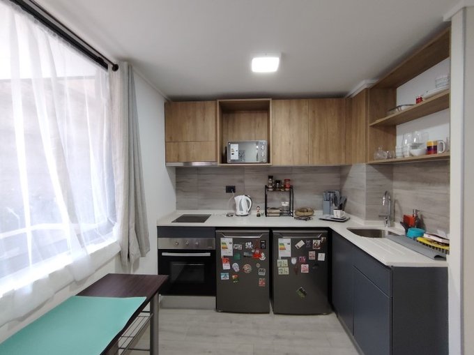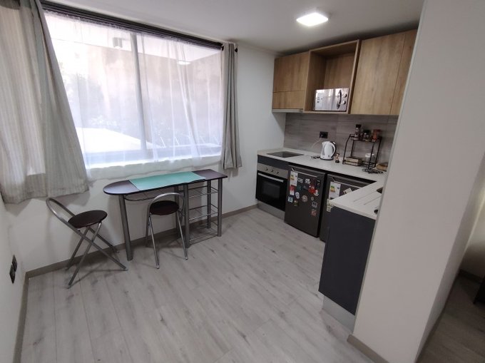 Amoblado con todo lo básico: cama de 2 plazas, 2 veladores, escritorio, tv; con luminarias y cortinas instaladas. Cocina amoblada y equipada con mesones de cuarzo, encimera de vitrocerámica, campana, horno, refrigerador y freezer; 100% eléctrico.