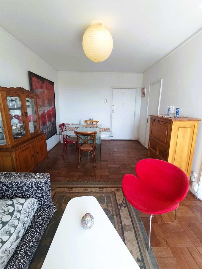 Distribución: Salón comedor integrado, cocina equipada, baño moderno y dormitorio independiente. Amoblado de calidad: Decoración funcional y sofisticada, listo para habitar. Vista desde los dos balcones hacia el Norte de Santiago.